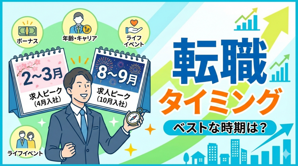 転職のベストタイミングは「2〜3月」と「8〜9月」です。この時期は求人数がピークを迎え、選択肢が最も広がります。ただし、年齢・ボーナス・ライフイベントなど個人の状況によって最適な時期は異なるため、本記事では月別・年代別・状況別に"損をしない転... -