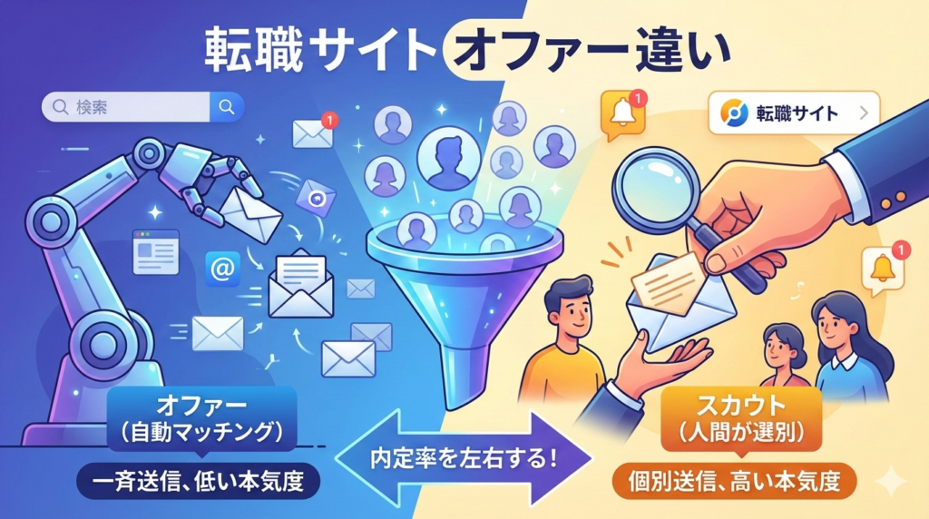 転職サイトに登録すると届く「オファー」と「スカウト」。名前が似ているため混同しがちですが、実は送信の仕組み・企業の本気度・内定率に大きな差があります。この記事では、主要転職サイト7社の公式情報とユーザーの実体験をもとに、オファーとスカウト... -