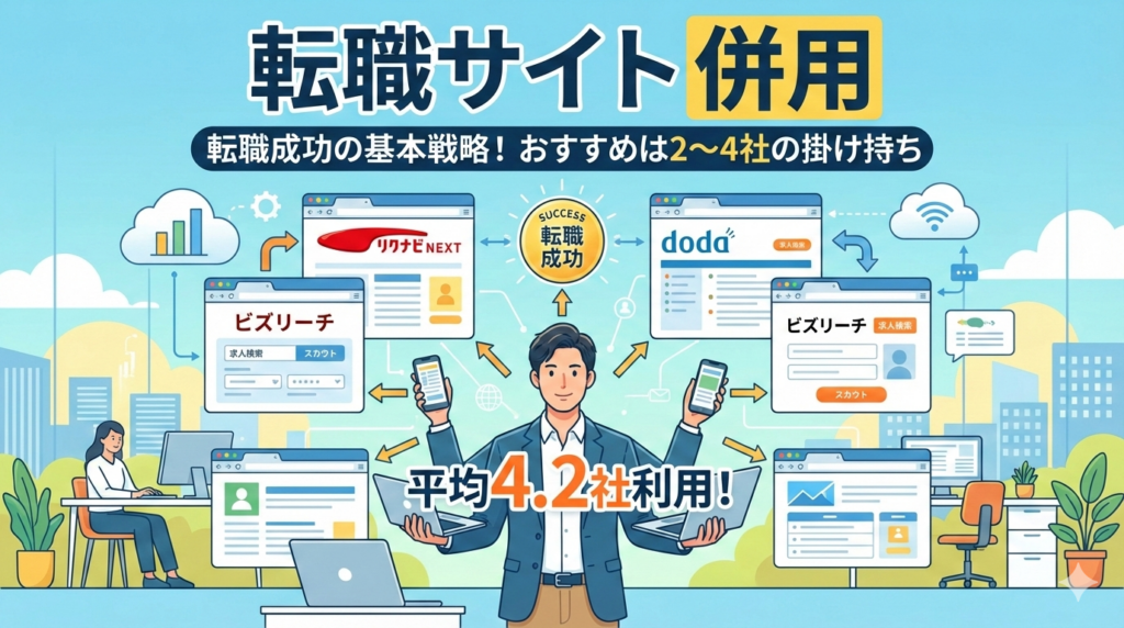 転職サイトやエージェントの併用は、転職成功者の多くが実践している基本戦略です。リクナビNEXTの調査では転職成功者の平均利用社数は4.2社というデータもあり、複数サービスの掛け持ちは「やっていい」どころか「やるべき」といえます。本記事では、併用... -