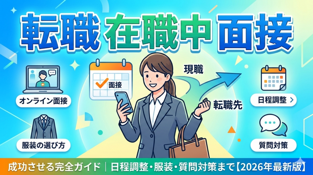 在職中の転職面接を成功させる完全ガイド|日程調整・服装・質問対策を徹底解説【2026年最新版】 在職中に転職活動を進めるうえで最大の壁となるのが「面接」です。マイナビの転職動向調査によると、転職者の約73.6%が在職中に転職活動を行っており、約8... -
