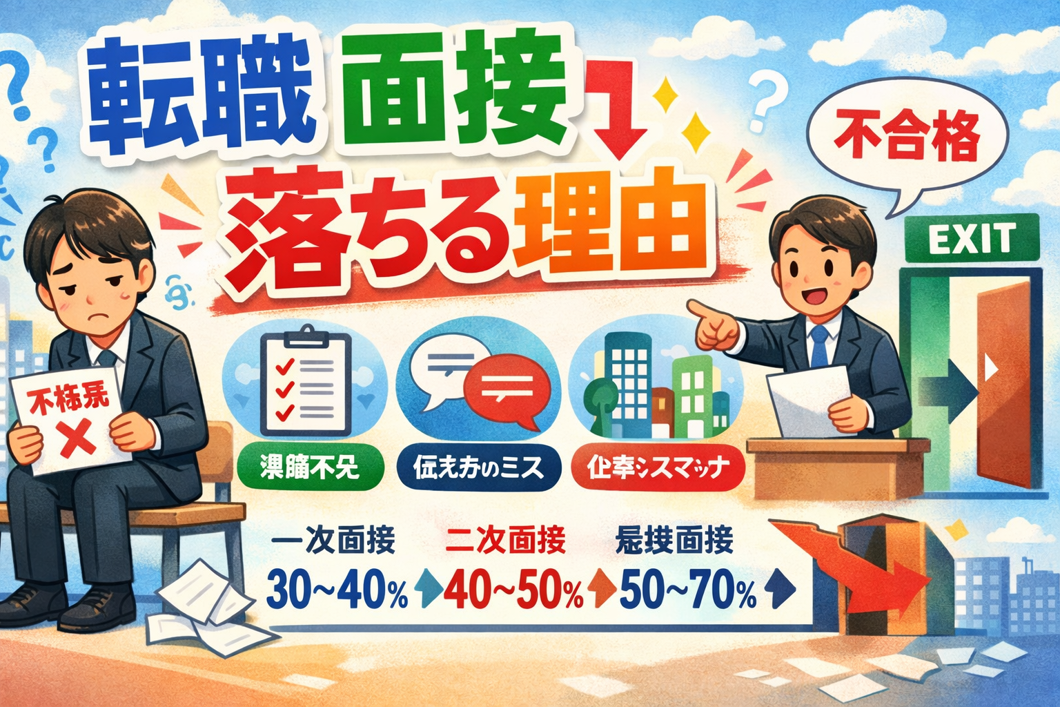 転職の面接で落ちる理由は、大きく分けると「準備不足」「伝え方のミス」「企業とのミスマッチ」の3つに集約されます。本記事では、面接官の本音や通過率データをもとに、一次・二次・最終面接それぞれで落ちる原因と具体的な対策を徹底解説します。