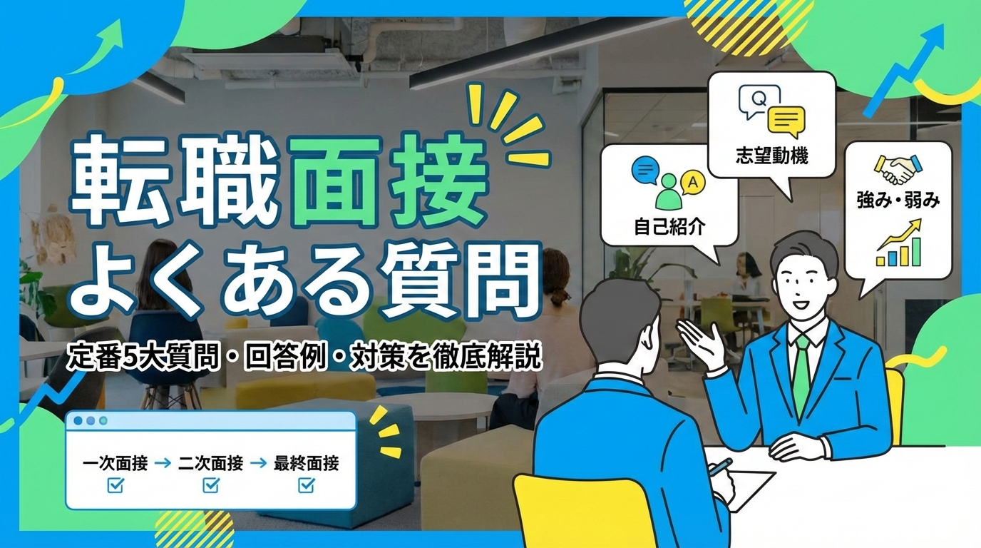 面接対策のノウハウをさらに体系的に知りたい方は、転職面接の対策を完全網羅|頻出質問と回答例・面接官が見ているポイントを元採用担当が徹底解説【2026年最新版】もあわせてご覧ください。