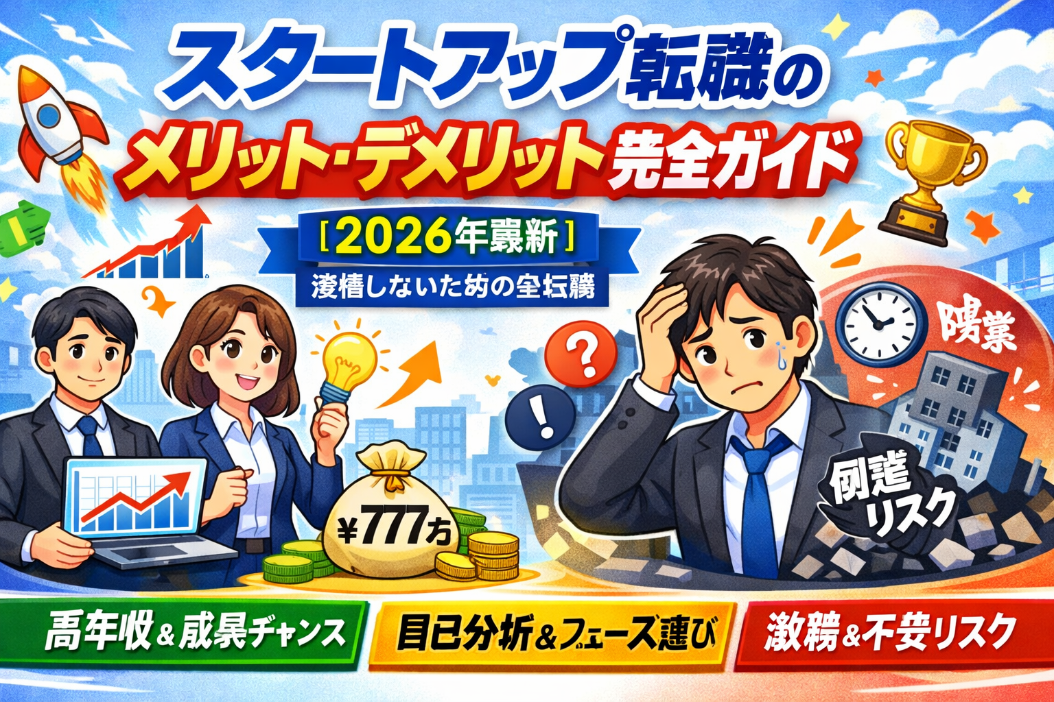 スタートアップ転職には、裁量の大きさ・急速な成長・ストックオプションによる資産形成・幅広いキャリアへの扉という大きなメリットがある一方、業務負荷の高さ・制度の未成熟・事業リスクというデメリットも厳然として存在します。2026年現在、有力スタートアップの平均年収は777万円に達し、大企業からスタートアップへの転職件数も2018年比7.1倍と市場は活況を呈しています。